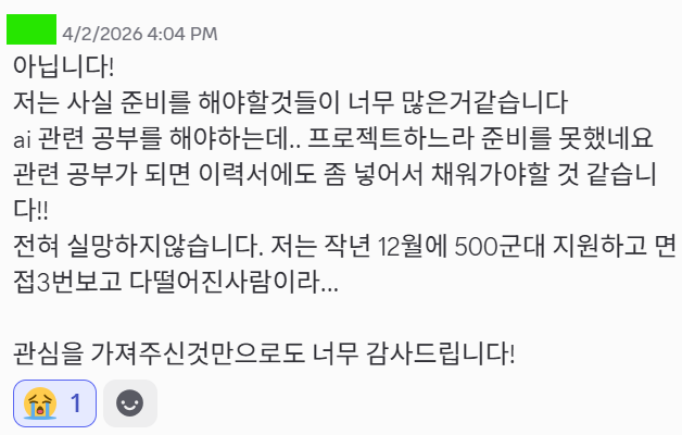 kt cloud techup 260403 건강 주의하기몇몇 직군은 진짜 채용 난이도 높음.. 그나마 클라우드 / 보안이 나은편이라 생각됨이분은 사이버 보안 과정은 아니지만 전체적으로 취업 난이도가 현재 높은 편으로 생각됨 (코로나 시기에 개발자 몸값 높게 대규모 채용 및 AWS 주니어 1년차 미만 전체 해고)