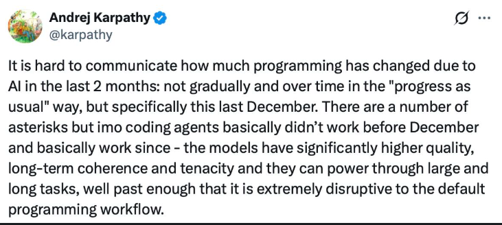 It is hard to communicate how much programming has changed due to AI in the last 2 months: not gradually and over time in the "progress as usual" way, but specifically this last December. There are a number of asterisks but imo coding agents basically didn’t work before December and basically work since - the models have significantly higher quality, long-term coherence and tenacity and they can power through large and long tasks, well past enough that it is extremely disruptive to the default programming workflow.