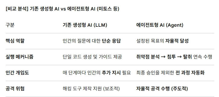 [비교 분석] 기존 생성형 AI vs 에이전트형 AI (미토스 등). 도표=글로벌이코노믹
