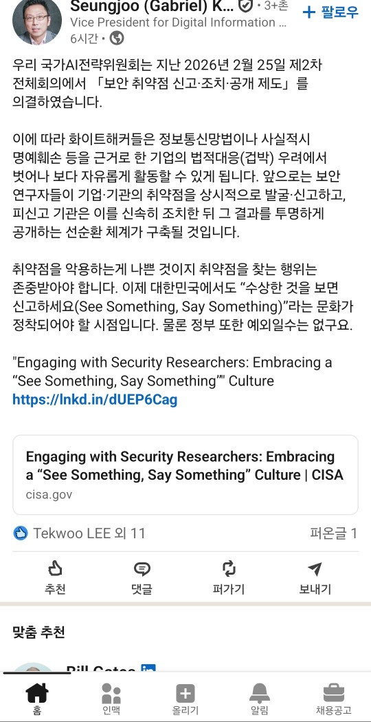 2026년 2월 25일 2차 국가AI전략위원회 / 전체회의 보안 취약점 신고 조치 공개 제도 의결 / 김승주교수님 (Gabriel) / 화이트해커