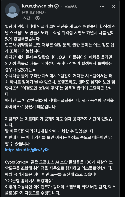 원글 출처: https://www.linkedin.com/posts/kyunghwan-oh-2068a11b1_rumsjm-suauikrtqrumsjm-tzctbsqtkree-share-7435162710494863360-Ge6m?utm_source=share&utm_medium=member_desktop&rcm=ACoAAFSi6CoBgLuUCY7lg_-WMdmzIsTGsWHBZL4