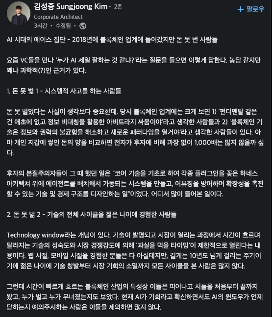 원글: https://www.linkedin.com/posts/sungjoongkim_ai-%EC%8B%9C%EB%8C%80%EC%9D%98-%EC%97%90%EC%9D%B4%EC%8A%A4-%EC%A7%91%EB%8B%A8-2018%EB%85%84%EC%97%90-%EB%B8%94%EB%A1%9D%EC%B2%B4%EC%9D%B8-%EC%97%85%EA%B3%84%EC%97%90-%EB%93%A4%EC%96%B4%EA%B0%94%EC%A7%80%EB%A7%8C-%EB%8F%88-%EB%AA%BB-share-7440253128454815746-Zwq9?utm_source=share&utm_medium=member_desktop&rcm=ACoAAFSi6CoBgLuUCY7lg_-WMdmzIsTGsWHBZL4